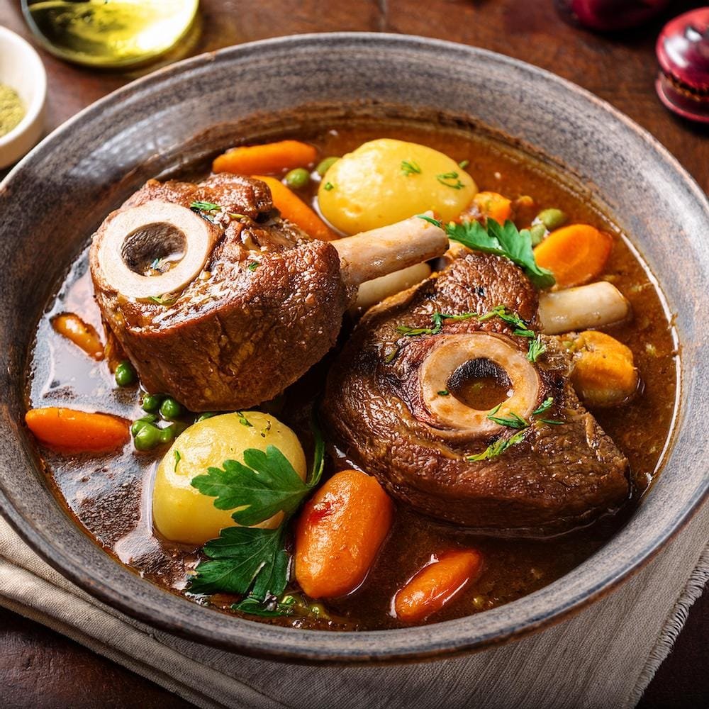 Osso bucco, or ossobuco, is a traditional Italian dish from the Lombardy region made with cross-cut veal shanks that are braised with vegetables, white wine, and broth. The name translates to “bone with a hole,” referring to the marrow-filled bone at the center of the shank, which adds rich flavor to the dish.